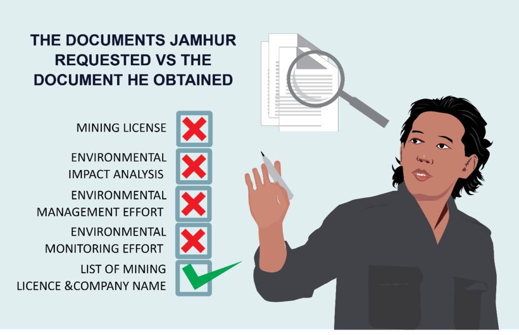 Unfortunately, Jamhur only received a list of company names, most of which are rock mining companies. He was advised to go to other government agencies to get the remaining documents. Jamhur followed the suggestion and went to the Environmental Agency to get the environmental impact analysis and to the One-Stop Service Agency to get the other requested mining license documents. However, like his previous experience, the related agencies only provided a list of mining company names after a period of waiting time.
