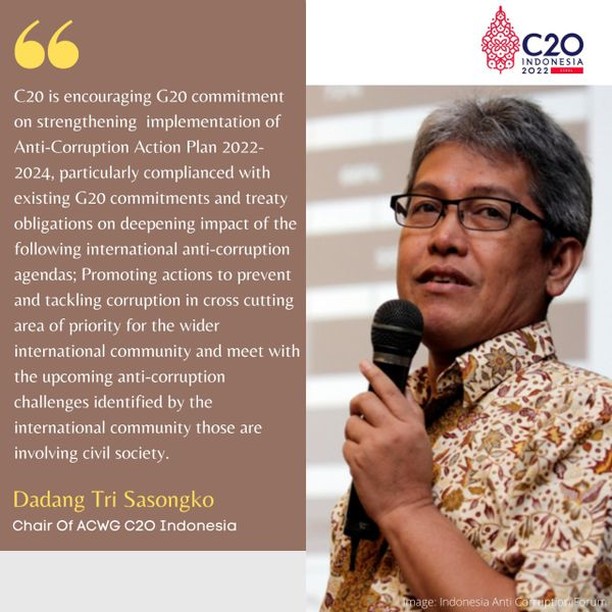 C20 is encouraging G20 commitment on strengthening implementation of Anti-Corruption Action Plan 2022-2024, particularly complianced with existing G20 commitments and treaty obligations on deepening impact of the following international anti-corruption agendas; Promoting actions to prevent and tackling corruption in cross cutting area of priority for the wider international community and meet with the upcoming anti-corruption challenges identified by the international community those are involving civil society.