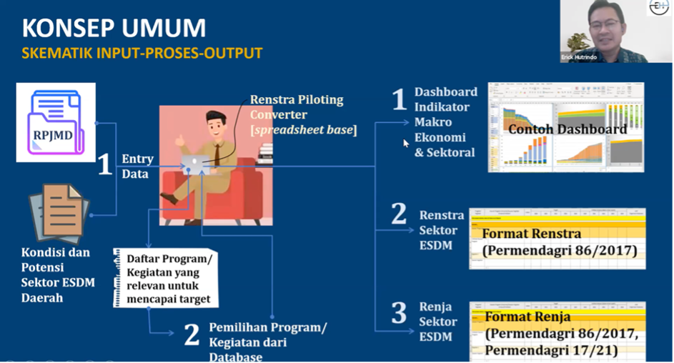 Erik Hutrindo, an expert in preparing the technical guide, explained that the initial input for this tool was based on the targets contained in the Regional Medium-Term Development Plan (RPJMD). The preparation of the strategic plan is obtained from the existing conditions and the existing potential in the region. Based on this data, this tool is expected to be able to provide an offer or a list of program activities that can support the Regional Medium-Term Development Plan (RPJMD) based on existing conditions and existing potential. The data entered will later produce output in the form of a Dashboard of Macro-Economic & Sectoral Indicators, a Strategic Plan in the Energy and Mineral Resource Sector.