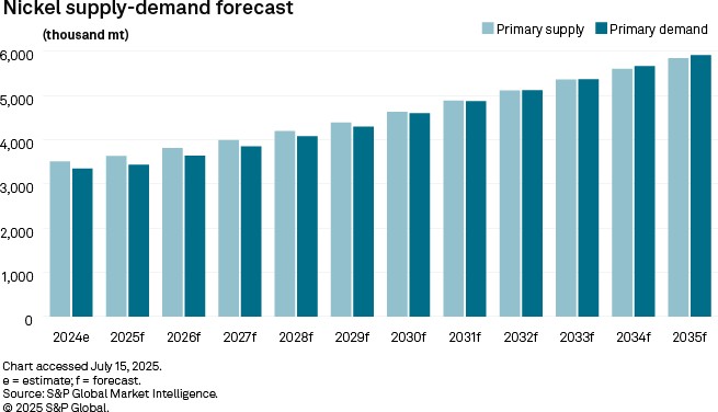 The near-term outlook remains bleak. The nickel market is expected to record a surplus of 198,000 metric tons in 2025, the fourth straight year that the market would be oversupplied, according to the latest Nickel Commodity Briefing Service report by Commodity Insights’ Metals and Mining Research team. The surplus is forecast to eventually dip to 12,000 metric tons in 2031 before swinging to a deficit of 5,000 metric tons in 2032, according to the report.