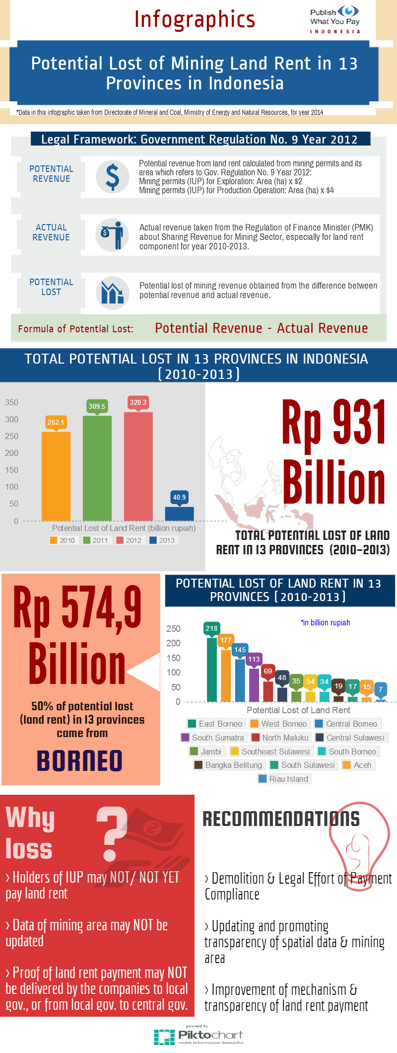 Around 70% of mining permits in Indonesia was located in 13 provinces, including Aceh, Bangka Belitung, Riau Island, South Sumatera, Jambi, West Kalimantan, Central Kalimantan, South Kalimantan, East Kalimantan, North Maluku, Central Sulawesi, South Sulawesi and Southeast Sulawesi. And potential lost of mining land rent there nearly reached IDR 1 trillion for four years (2010-2013).