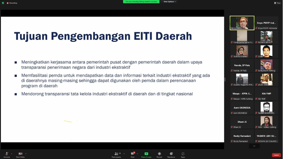 The online training facilitated by Tenti Kurniawati, Executive Director of IDEA Yogyakarta, and Ibrahim Fahmy Badoh, Researcher of PWYP Indonesia, was attended by participants from CSO representatives in Central Sulawesi such as KoMIU Central Sulawesi, JATAM Central Sulawesi, KPPA Central Sulawesi, Sikola Mombine, WALHI Central Sulawesi, Solidaritas Perempuan Palu, Yayasan Tanah Merdeka, and others and also attended by Civil Society Representatives in the Extractive Industries Transparency Initiatives (EITI) Indonesia Implementation Team.