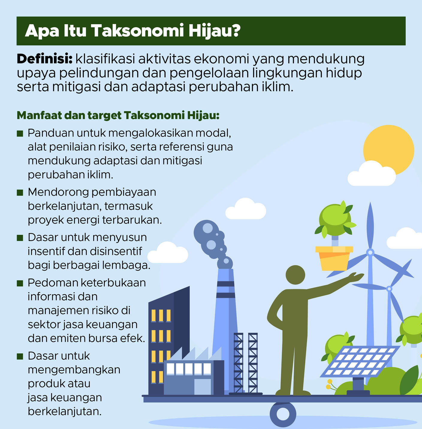OJK merilis Taksonomi Hijau Indonesia pada Januari 2022. Taksonomi Hijau adalah klasifikasi kegiatan ekonomi berdasarkan penilaian atas aktivitas bisnisnya, apakah memenuhi standar perlindungan lingkungan dan tata kelola yang baik atau sebaliknya. OJK menyusun Taksonomi Hijau berdasarkan Klasifikasi Baku Lapangan Usaha Indonesia atau KBLI yang terdiri atas 2.733 sektor. Taksonomi Hijau menjadi panduan bagi bank dan lembaga keuangan untuk menyalurkan pendanaan pada sektor usaha berdasarkan risiko atau dampaknya terhadap lingkungan. Ini juga yang menjadi salah satu indikator ekonomi hijau.