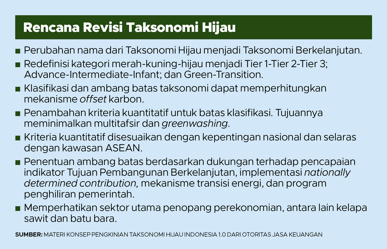 Di tengah hiruk-pikuk ini, OJK tak hanya merombak isi dan kriteria bisnis hijau dalam Taksonomi Hijau. Nama pedoman itu pun akan diganti: Taksonomi Berkelanjutan.