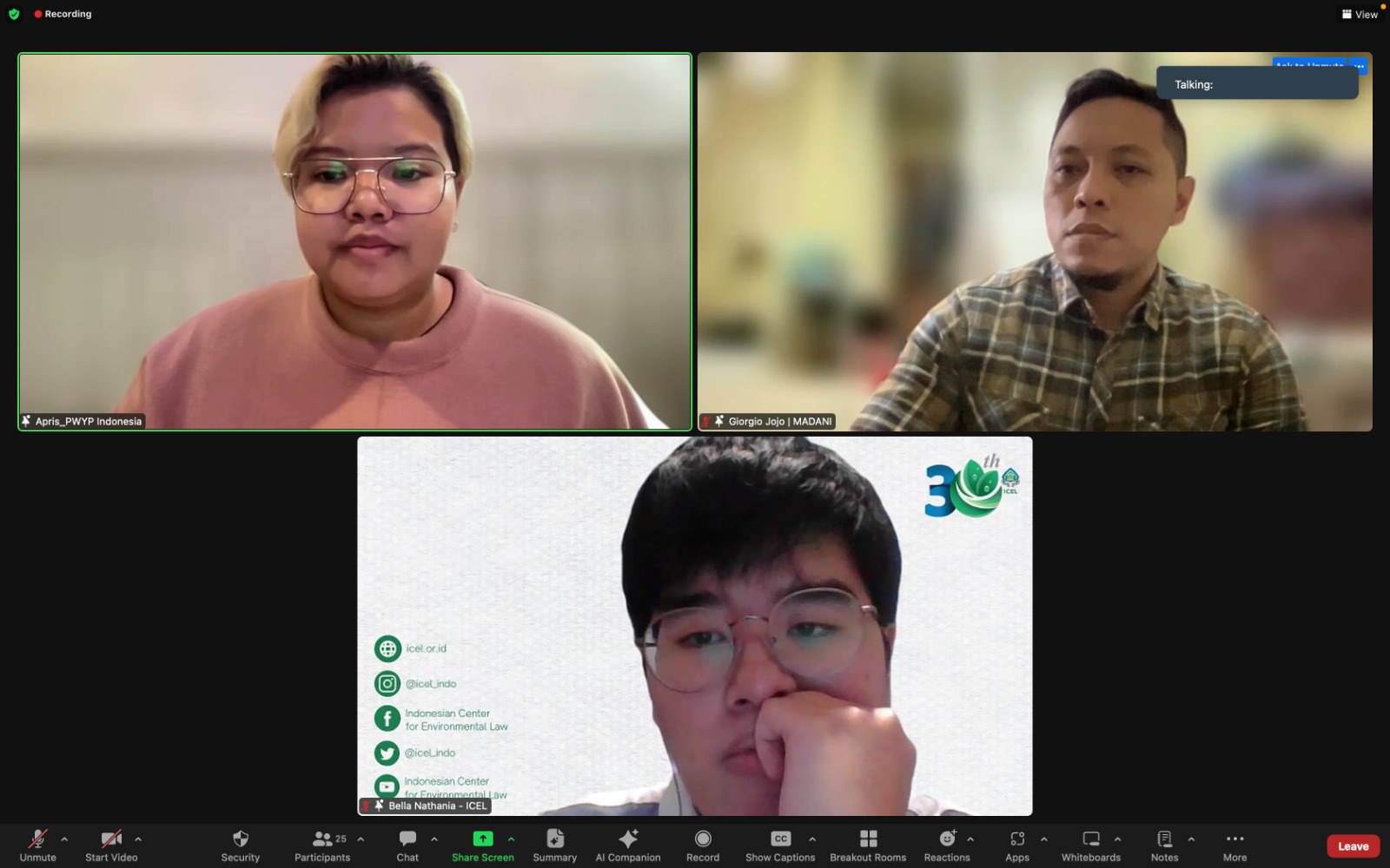 Bella Nathania, peneliti Indonesian Center for Environmental Law (ICEL) menyampaikan perbandingan pengalaman China dan Australia dalam membuka data emisi karbon. China misalnya, berhasil mengurangi 2/3 emisi karbon setelah data tersebut dibuka ke publik. Artinya, dengan dibukanya data emisi ke publik, ada cara-cara yang dapat ditindaklanjuti oleh pemerintah untuk mengatasi perubahan iklim lewat masukan-masukan dari masyarakat. Sayangnya, hukum di Inonesia masih cenderung multitafsir dan memiliki tone yang negatif. Sehingga, kita tidak dapat menggunakan satu kerangka hukum untuk menafsirkan hukum kelingkunganan. Dengan kata lain,masih banyak sekali pekerjaan rumah untuk hukum keterbukaan data emisi di Indonesia .
