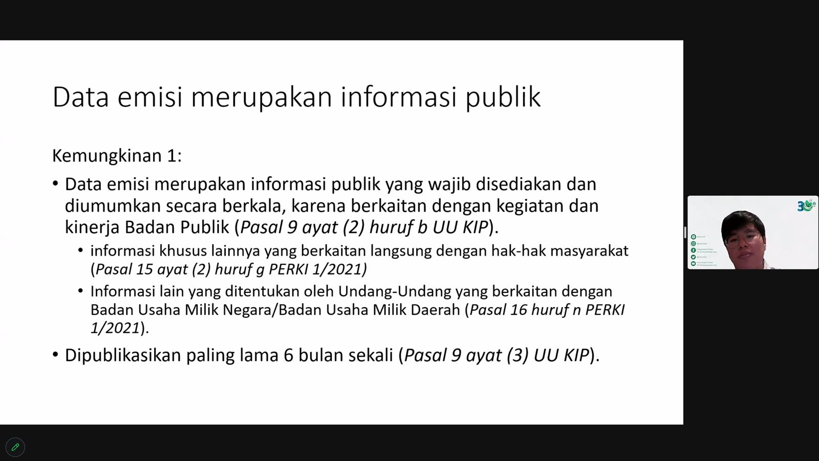 Meskipun Indonesia telah menetapkan target penurunan emisi yang ambisius, dalam sidang keterbukaan informasi terbaru terungkap bahwa PT. PLN (Perusahaan Listrik Negara) dan Pemerintah masih mempertahankan pandangan bahwa data emisi merupakan informasi yang dikecualikan dalam Undang-Undang (UU) Nomor 14 Tahun 2008 tentang Keterbukaan Informasi Publik (Kompas, 2023). Padahal, transparansi terkait data emisi menjadi kunci dalam menghadapi dampak perubahan iklim, dan seharusnya data ini bisa diakses oleh publik, bahkan dipublikasikan tanpa terhalang oleh status informasi rahasia perusahaan atau negara.