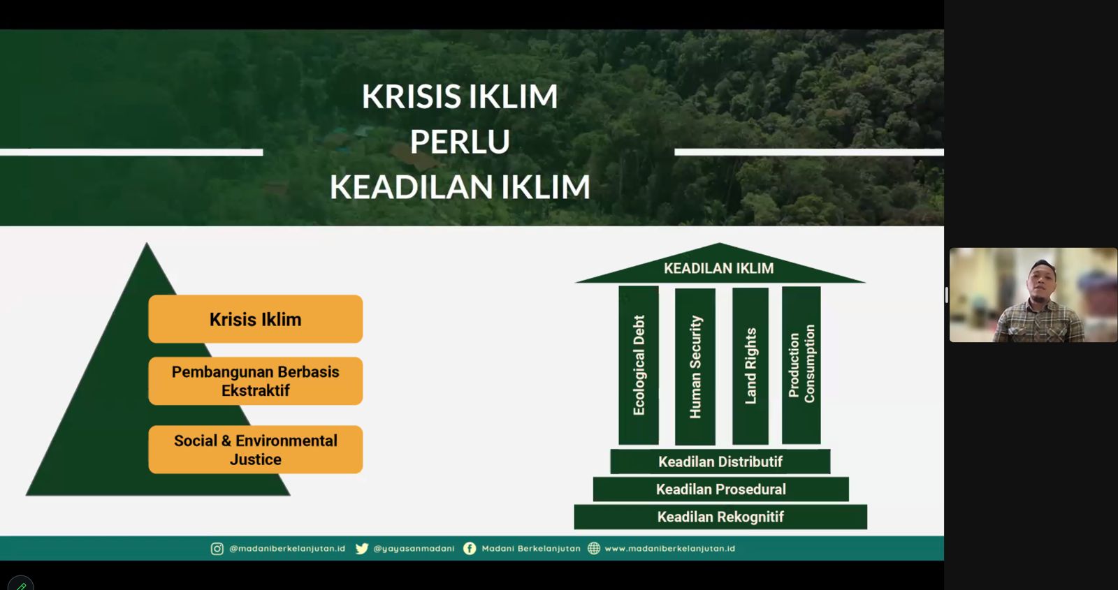 Giorgio “Jojo” Budi Indrarto, Direktur Program Madani Berkelanjutan menjelaskan bagaimana menakar perdagangan karbon dari kacamata keadilan iklim di Indonesia. Perdagangan karbon hanyalah satu dari tiga mekanisme Nilai Ekonomi Karbon (NEK) yang disebutkan dalam Peraturan Presiden Nomor 98 Tahun 2021. Sedangkan dua lainnya adalah pembayaran berbasisi kinerja (Result Based Payment – RBP) dan pungutan atas karbon. Menurut Jojo, Indonesia belum memiliki satu pun standar sertifikasi yang memenuhi kriteria penting perdagangan karbon secara menyeluruh. Begitu juga standar safeguards yang terintegrasi untuk seluruh aksi mitigasi dan adaptasi perubahan iklim. Untuk itu, perlu ada upaya untuk mengkonsolidasikan berbagai standar safeguards sosial dan lingkungan yang ada.