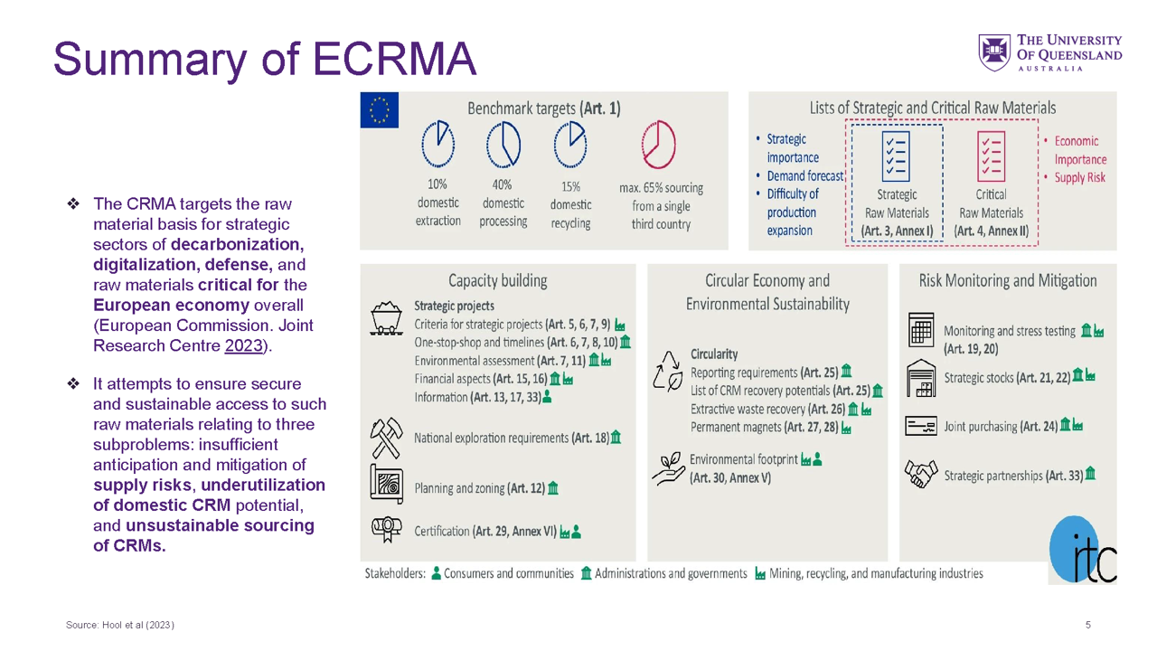 Diskusi dibuka oleh Emanuel Bria yang menjelaskan latar belakang dan tujuan EU CRMA. Undang-undang ini mengidentifikasi daftar mineral mentah kritis dan bahan baku strategis dan menetapkan target dalam hal pasokan dan pengolahannya untuk dicapai pada tahun 2030. Setidaknya 10% dari konsumsi tahunan Uni Eropa digunakan untuk ekstraksi; setidaknya 40% dari konsumsi tahunan Uni Eropa untuk pengolahan; setidaknya 15% dari konsumsi tahunan Uni Eropa untuk daur ulang; dan tidak lebih dari 65% konsumsi tahunan Uni Eropa untuk setiap bahan baku strategis pada setiap tahap pemrosesan yang relevan berasal dari satu negara ketiga. EU CRMA menargetkan basis bahan baku untuk sektor-sektor strategis dekarbonisasi, digitalisasi, pertahanan, dan bahan baku yang penting bagi ekonomi Eropa secara keseluruhan.