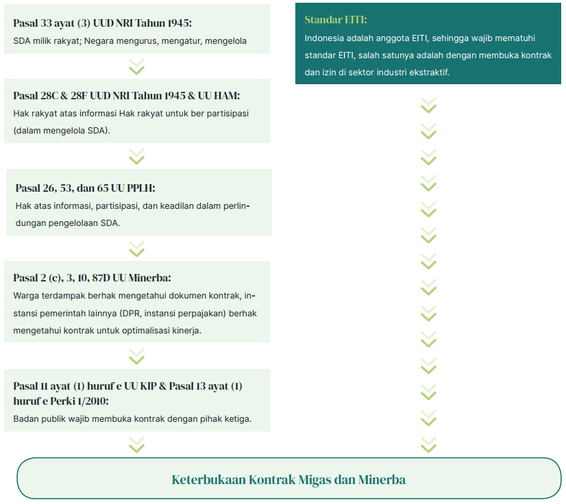 Keterbukaan kontrak pengelolaan kekayaan alam Indonesia ini dapat dilihat dalam beberapa perspektif, yaitu: pertama, sebagai bentuk pertanggungjawaban pemerintah dalam menjalankan mandat kolektif rakyat Indonesia untuk mengurus dan mengelola kekayaan alam Indonesia yang menjadi milik bersama seluruh rakyat Indonesia. Kedua, salah satu makna pelaksanaan kewenangan penguasaan negara atas kekayaan alam Indonesia sebagaimana dimaksud Pasal 33 UUD NRI Tahun 1945 adalah dengan memberikan ruang partisipasi rakyat dalam pengurusan dan pengelolaan kekayaan alam Indonesia. Ketiga, sebagai bentuk pelaksanaan tujuan UU KIP. Keempat, sebagai bentuk pelaksanaan Undang-Undang No. 30 Tahun 2014 tentang Administrasi Pemerintahan khususnya yang terkait dengan asas pelindungan hak asasi manusia, dan asas-asas umum pemerintahan yang baik(AUPB) sebagaimana diatur dalam UU No. 30/2014, khususnya asas kemanfaatan, asas ketidakberpihakan, asas kecermatan, asas keterbukaan, dan asas kepentingan umum