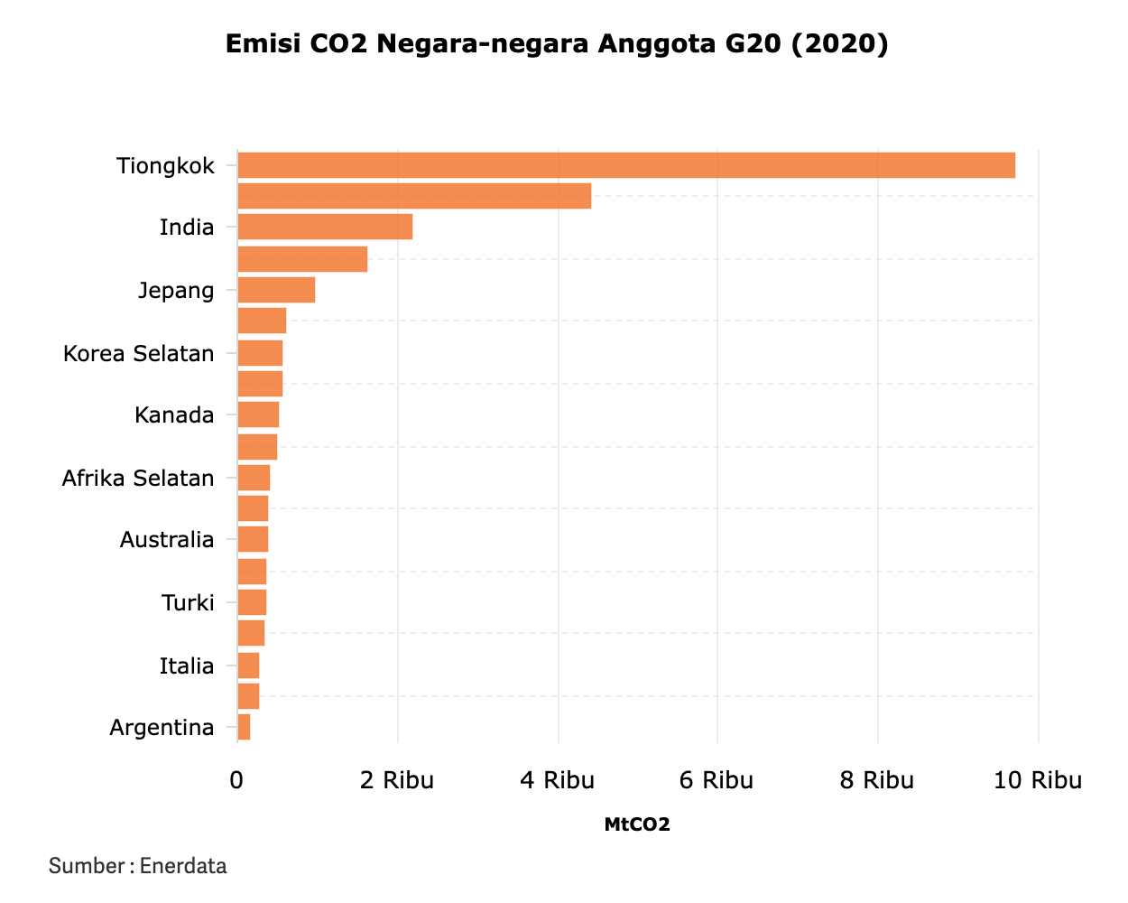 G20 sebagai kelompok negara yang mendominasi sistem ekonomi global dan menjadi rumah bagi dua pertiga dari populasi dunia bertanggung jawab terhadap 78% emisi karbon global. Simak databoks berikut: