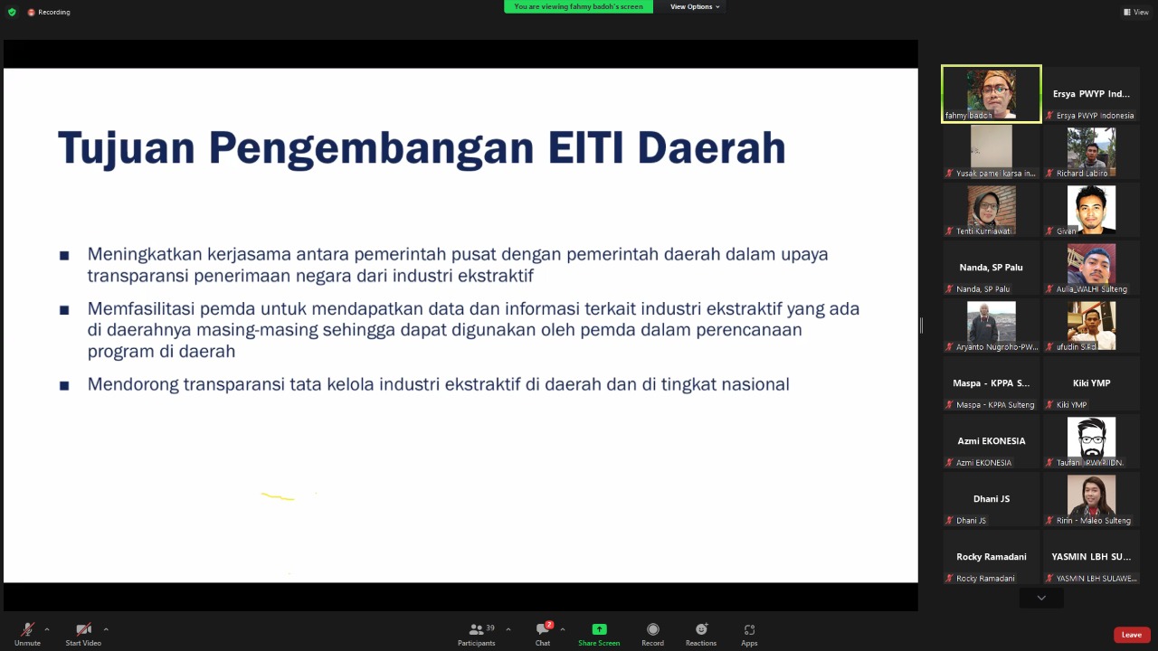 Pelatihan secara secara daring yang difasilitasi oleh Tenti Kurniawati, Direktur Eksekutif IDEA Yogyakarta dan Ibrahim Fahmy Badoh, Peneliti PWYP Indonesia ini, dihadiri oleh peserta dari perwakilan CSO di Sulawesi Tengah seperti KoMIU Sulteng, JALTAM Sulteng, KPPA Sulteng, Sikola Mombine, WALHI Sulteng, Solidaritas Perempuan Palu, Yayasan Tanah Merdeka dan lainnya. Juga dihadiri oleh Perwakilan Masyarakat Sipil dalam Tim Pelaksana Extractive Industries Transparency Initiatives (EITI) Indonesia.