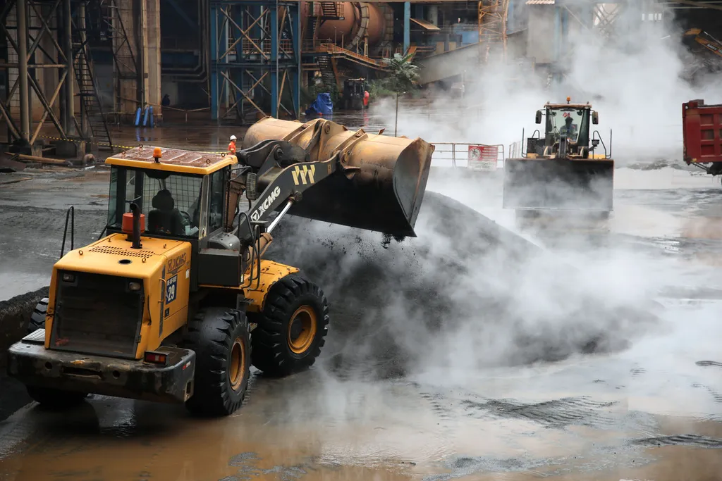Menggunakan alat berat, pekerja memindahkan slag nikel, salah satu limbah pengolahan nikel berbentuk seperti pasir, di lokasi penambangan dan industri pengolahan nikel grup Harita Nickel yang berada di Pulau Obi, Halmahera Selatan, Maluku Utara, Selasa (2/7/2024).