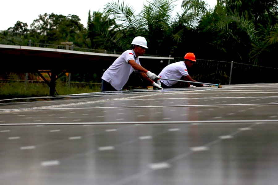 Dua pekerja tengah membersihkan panel surya yang berada di Dusun Talang Aro, Batanghari Jambi. Foto: Elviza Diana/ Mongabay Indonesi