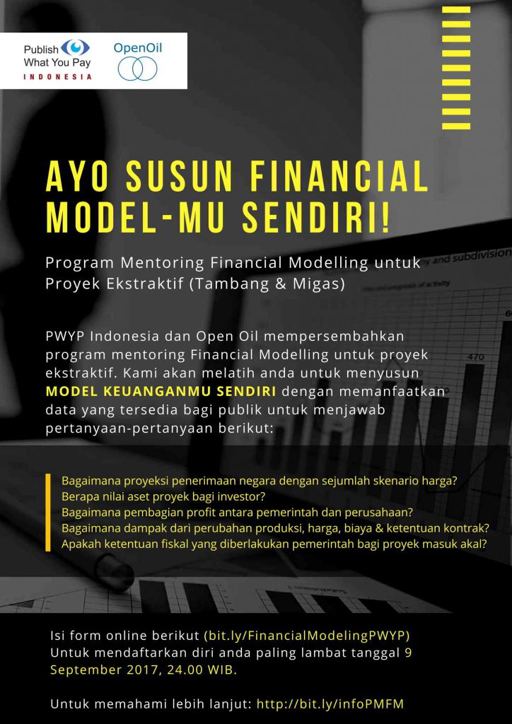 Publish What You Pay (PWYP) Indonesia merupakan koalisi masyarakat sipil untuk transparansi dan akuntabilitas tata kelola sektor sumber daya ekstraktif, migas, pertambangan mineral dan batubara, serta sumber daya alam lainnya. PWYP Indonesia berkolaborasi dengan Open Oil, lembaga konsultasi dengan spesialiasi open data dan sumber daya alam yang berkedudukan di Berlin akan melaksanakan program mentoring terkait financial modelling di sektor industri ekstraktif, khususnya migas dan tambang.
